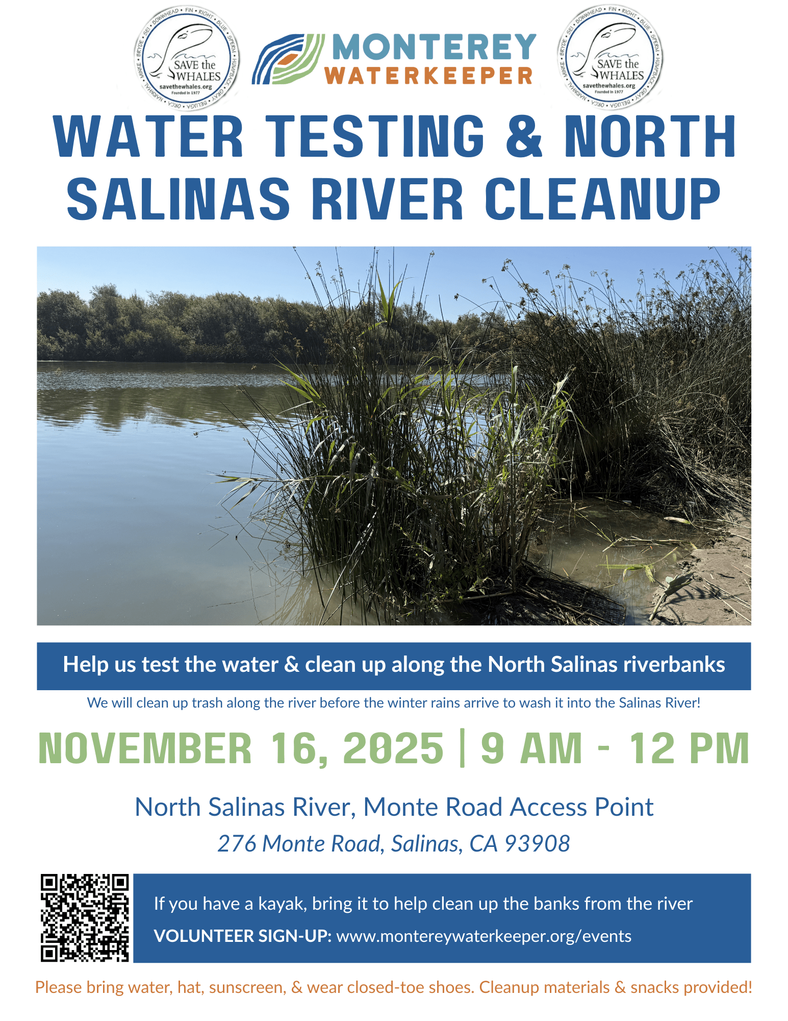 Join Monterey WaterKeeper and Save the Whales!. Help test the Salinas River water & pick up trash along the river bed before the rains arrive and wash it into our river! BRING A KAYAK!