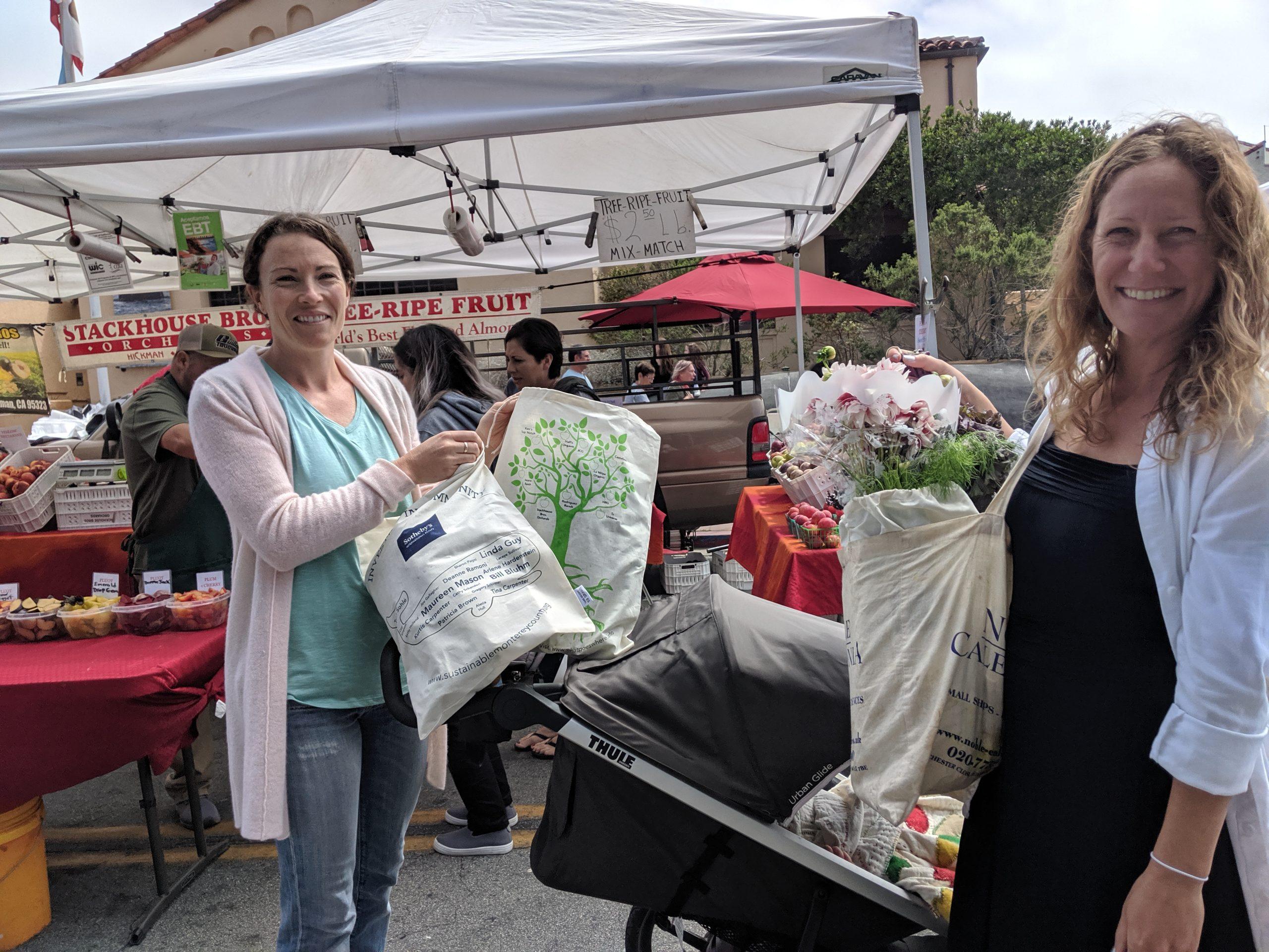 CSMC partnered with MRWMD in their rollout of recycling changes at farmers markets by offering (with small donation to cover costs) youth-decorated cloth produce bags (see past projects). From that program, we realized that the public’s habitual use of plastic produce bags requires non-plastic alternatives be as free and convenient as plastic bags are currently. So we initiated a program to ask businesses to sponsor cloth bags (via a tax-deductible donation to CSMC) that would, in return display their printed business name on the bag in sizes relative to their donated amount. The program, piloted in Pacific Grove and Seaside farmers markets was a highly successful win-win-win for farmers, environment, and the investing, supporting businesses.